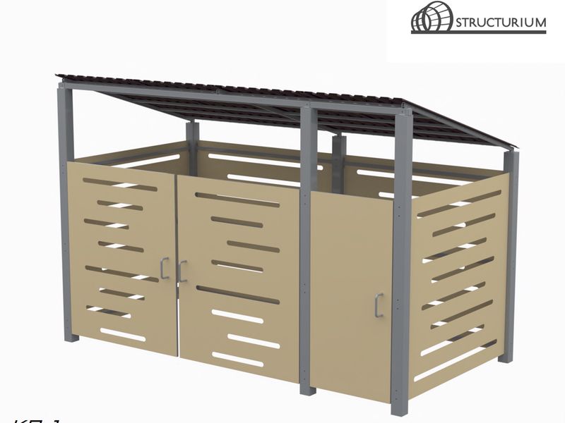 При производстве Контейнерной площадки используется профильная труба 120*120*3мм, 60*40*3мм и 40*35*2мм. Покрытие крыши – профлист. Обшивка по периметру – алюминиевые композитные панели. Покраска полимерная порошковая с предварительным нанесением цинкосодержащего грунта, цвет серый.